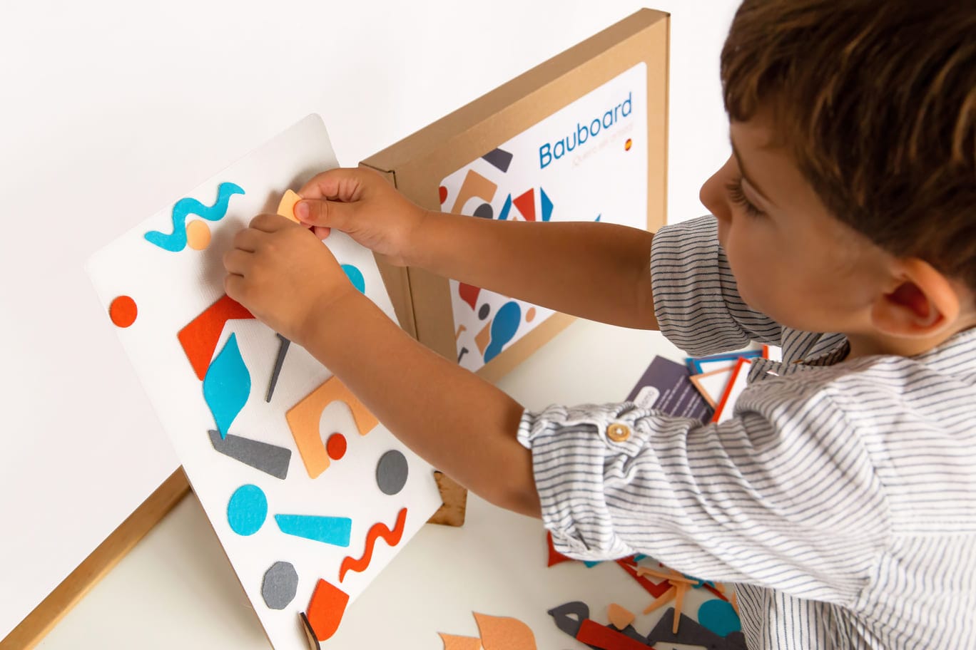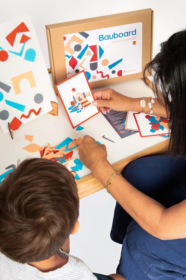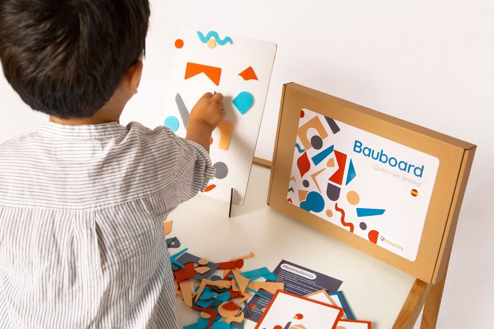 Bauboard «¡Quiero ser artista!» es un juego artístico y educativo que está desarrollado a base de 108 piezas de fieltro geométricas y orgánicas y 4 colores recurrentes en el arte. El juego contiene 10 tarjetas con diferentes estilos artísticos. Con Bauboard® aprendemos jugando mediante el pegado de piezas geométricas y orgánicas de fieltro en la tabla de lienzo blanco acabada en velcro con el fin de componer obras de arte basadas en estilos artísticos. Es posible copiar la creación que se propone de ejemplo en las 10 tarjetas que están relacionadas a cada estilo o realizar sus propias creaciones. Las tarjetas proporcionan información sobre cada movimiento artístico y, además, nos exponen artistas destacados y obras representativas. Cada tarjeta contiene un reto para poder dar rienda suelta a nuestra imaginación y practicar lo aprendido. Las creaciones se conservan en el lienzo apoyado en nuestro atril Bauplay® o colgado en la pared como una obra de arte que se puede rehacer o cambiar tantas veces como te apetezca.